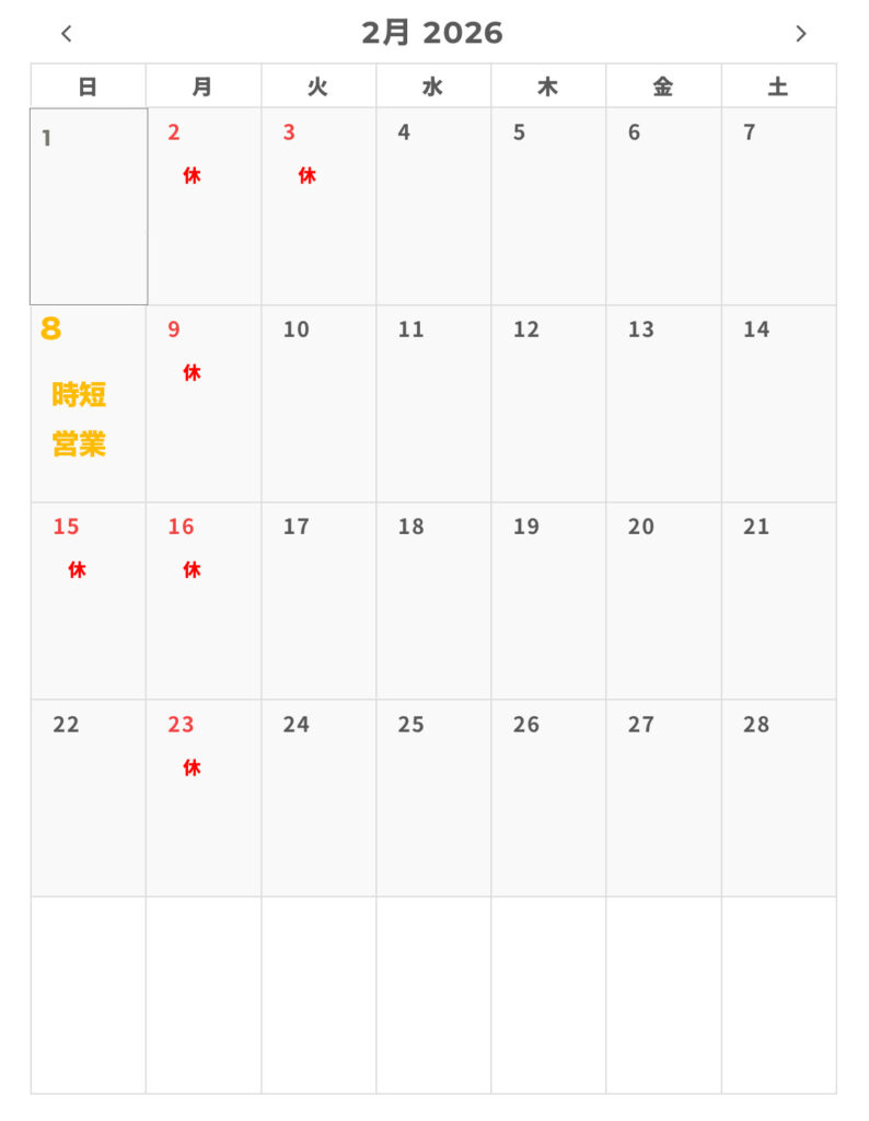 赤い数字が定休日/黄色が時短営業日です。